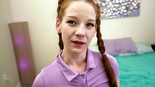 Redhead cutie Amy Quinn drops on her knees to make him hard