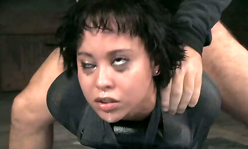 Huge-chested short haired cougar belted to the bench and torn up rock hard